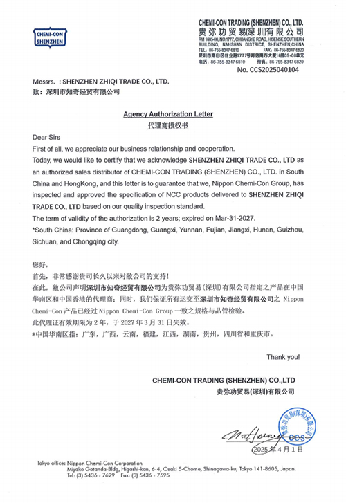 日本黑金剛(NIPPON CHEMI-CON)電容、韓國三瑩(SAMYOUNG)電容、東陽光(HEC)電容、凱美(KAMCAP)超級電容、成鎬薄膜電容、泰容薄膜電容、貝特保險管、大毅電阻、天二特殊電阻、CROWN散熱風(fēng)扇等多家國內(nèi)外知名品牌一級代理及華南區(qū)域總代理授權(quán)。